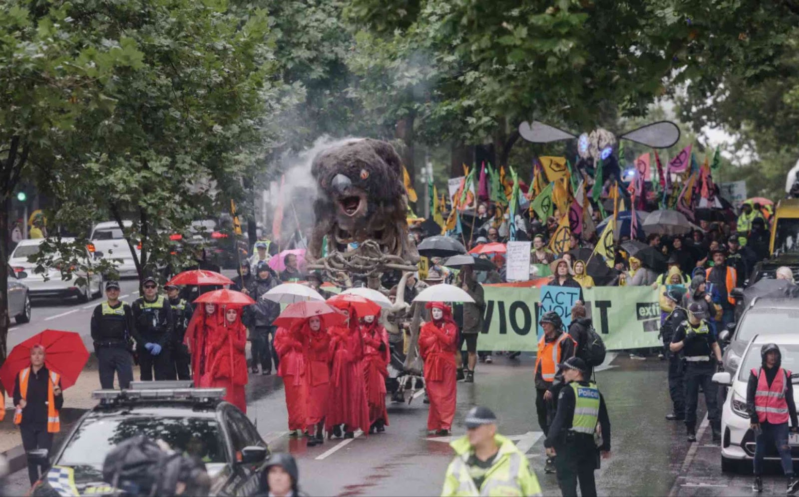 5–10 DEC | Melbourne, Australia: The December Rebellion disrupts city traffic for four days, culminating in a massive slow march and sit-down that saw 75 arrests. Indigenous groups, Red Rebels, and Blinky the giant burning koala, joined hundreds on the streets to resist seismic blasting, fossil fuels, and the global war machine. Photo: Ari Hatzis