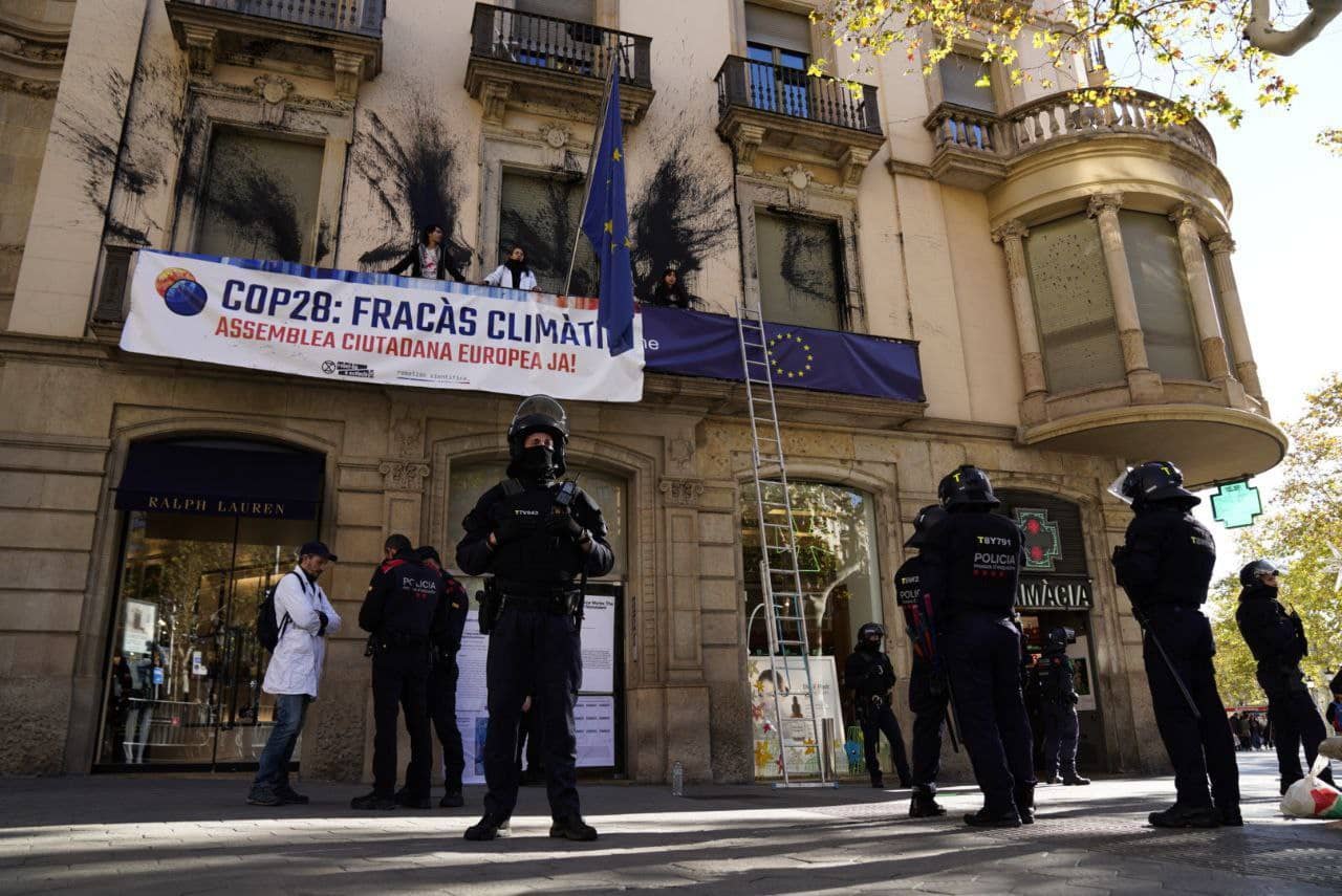 2 DECEMBER | Barcelona, Spain: Rebels occupy the Barcelona European Parliament office to denounce COP and demand a European Citizens' Assembly. They sprayed the building with black paint, dropped a banner, and chained themselves to the balcony, while others blocked the road outside.