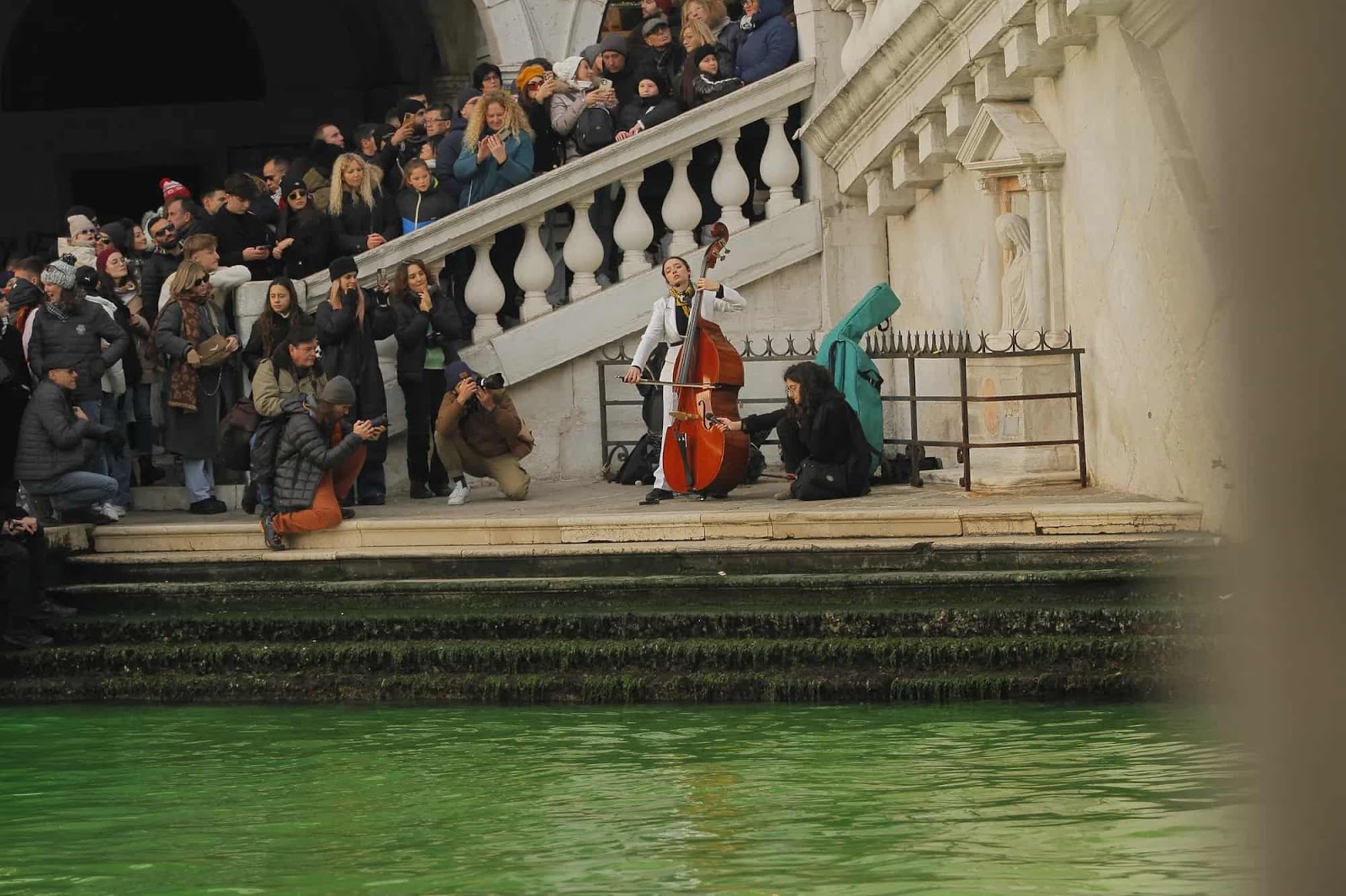 A rebel plays her double bass under the Ponte di Rialto. She was arrested, and the instrument was confiscated by the police.