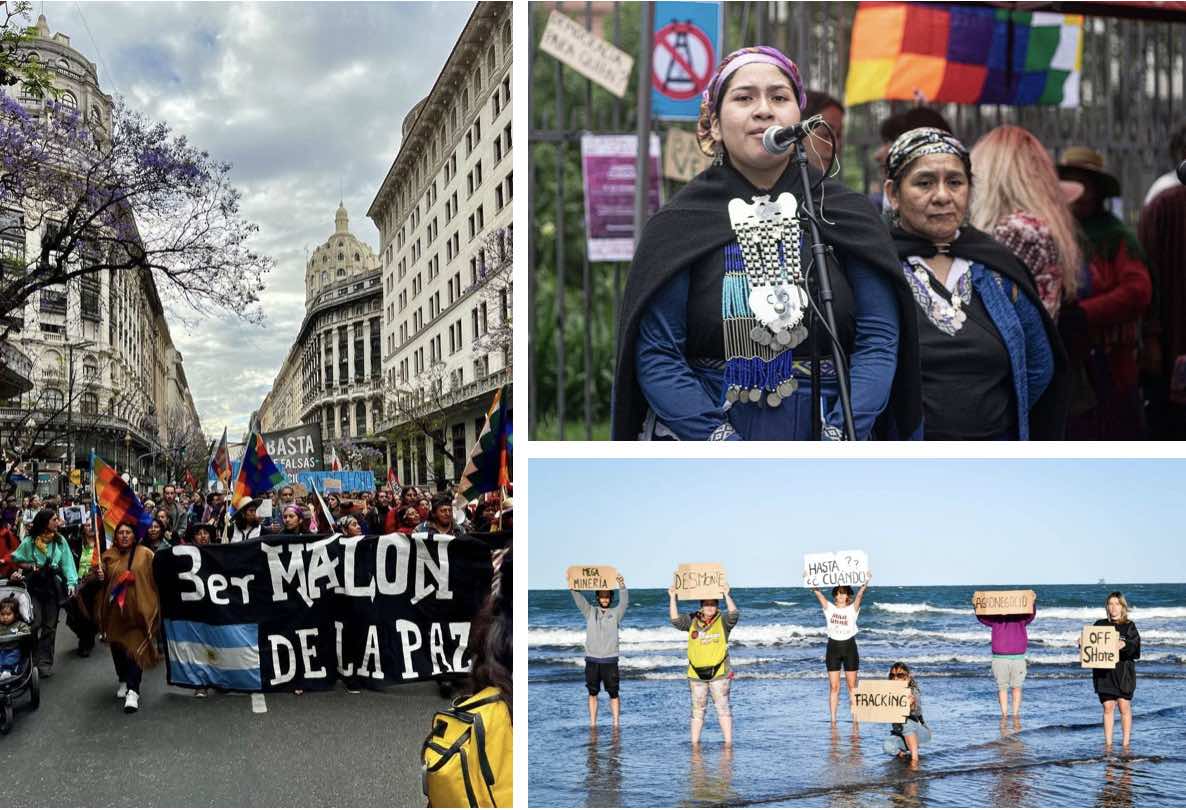 A delegation from Jujuy join the march in Buenos Aires (left), a Mapuche woman talks about the suffering caused by extractivism in Patagonia (top right), and rebels protest beside the Argentine Sea, which is earmarked for offshore oil drilling.