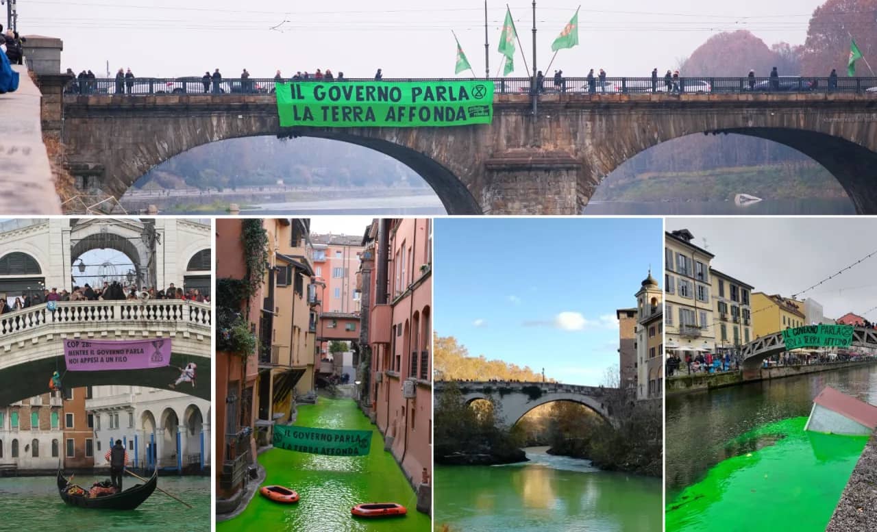 Here’s what the Italian government considers so dangerous: In a coordinated day of action, rebels turned the rivers of six cities green with a harmless dye to denounce the inaction of COP28, and used climbing gear to suspend themselves from bridges to show how life is hanging by a thread.