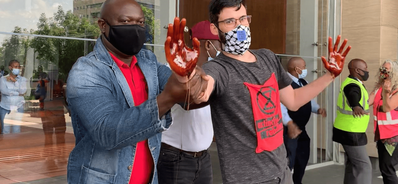 Rebels gathered at Standard Bank’s offices in Johannesburg, carrying placards that read “we are watching you” and “inaction is a weapon of mass destruction”. They poured treacle over forecourt flagstones then used it to leave handprints on the office walls, a symbolic act to show how the bank has prioritised dirty oil over lives and livelihoods.