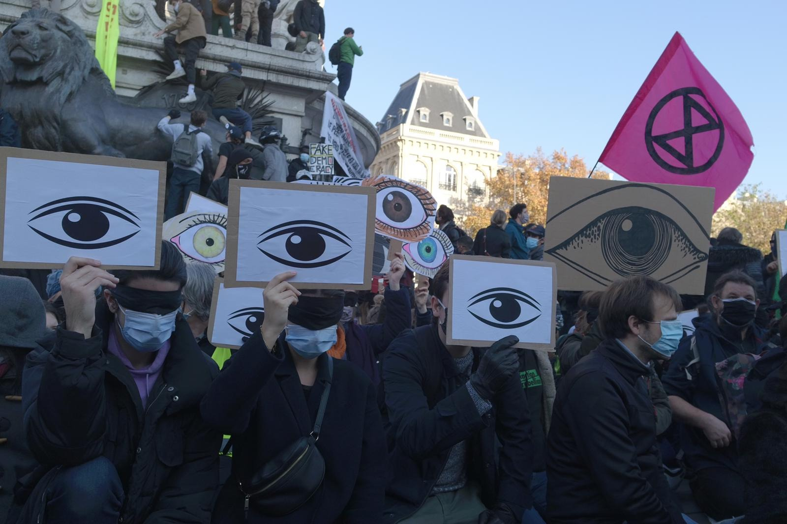 28 Nov | France: Rebels & other activists on Place de la République demonstrate against the new authoritarian and unjust Global Security Bill.