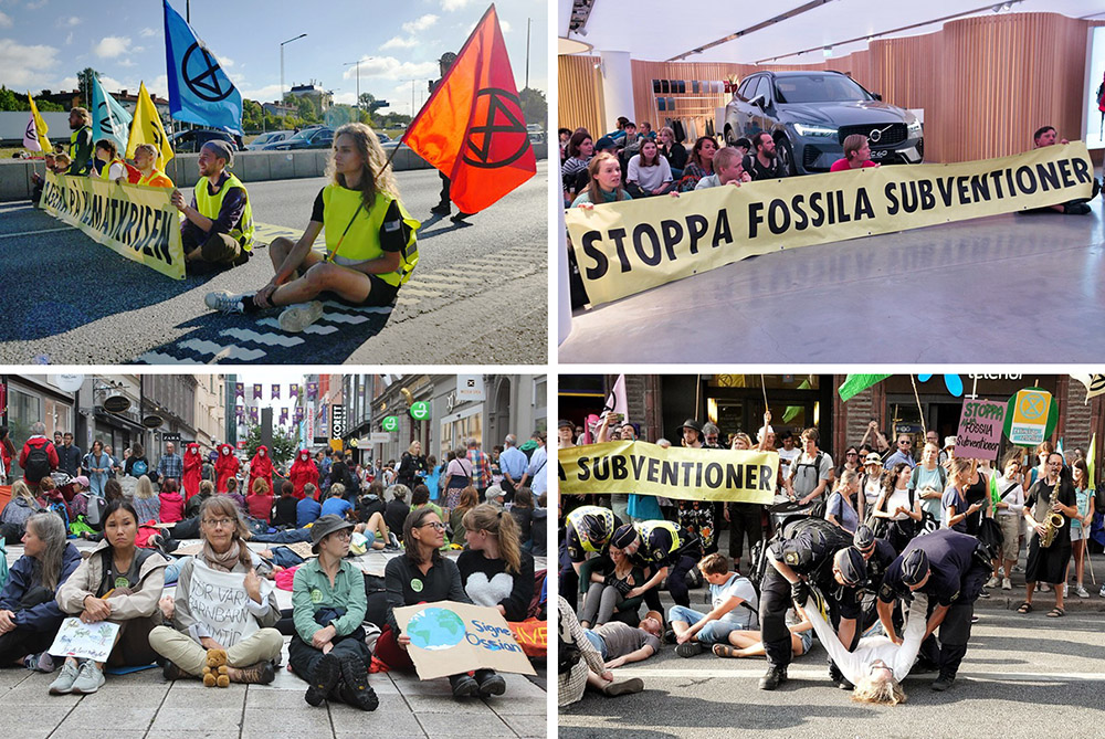 Clockwise from top left: XR rebels blocking a major road in Stockholm; rebels invite themselves into a Volvo showroom; the ‘Rebellmammorna’ occupy the city centre; rebels being pulled off the road by police.