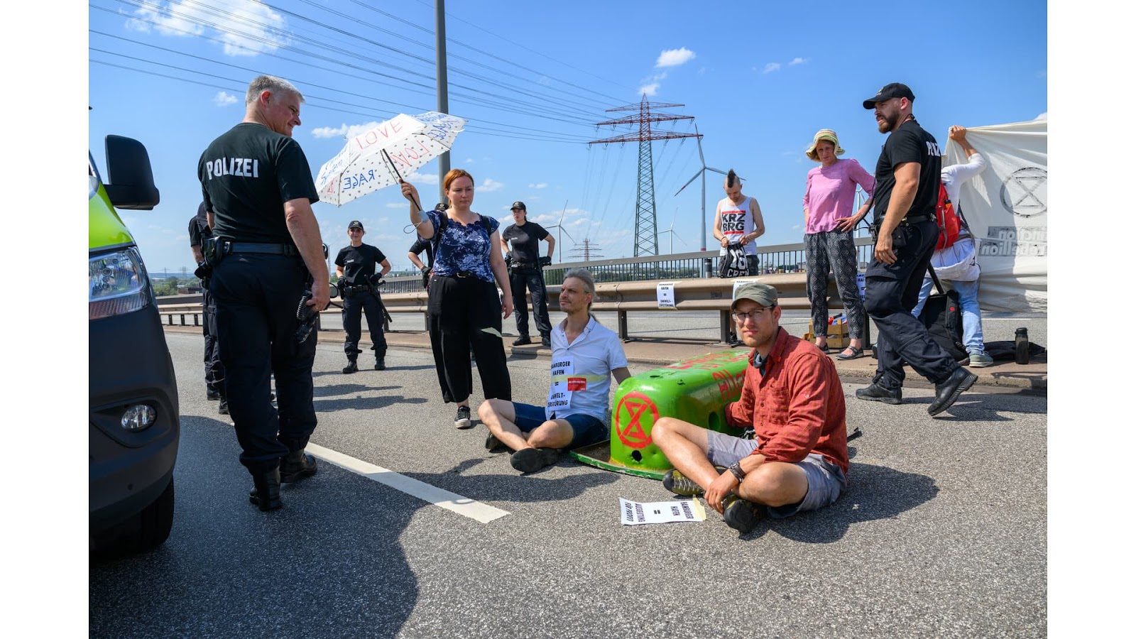 With temperatures soaring above 30 degrees, around thirty rebels blocked Koehlbrand bridge, a key access route to the port, dragging an upturned bathtub filled with concrete from a van before locking their arms within it. It took police about four hours to pull them free.