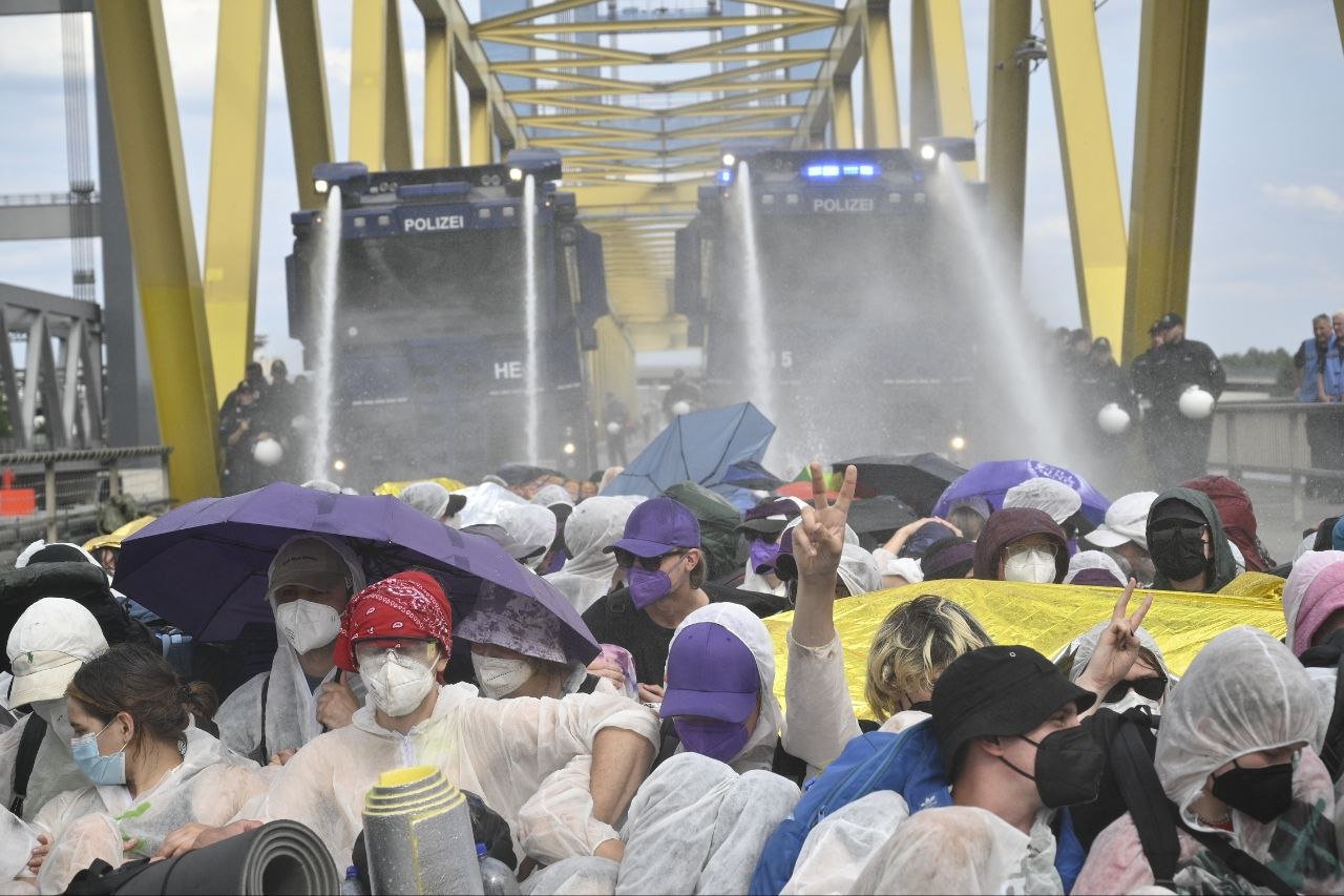 Police fire water cannons at Ende Gelände activists as they block a bridge into the Port of Hamburg. The umbrellas were brought as protection from the scorching sun.