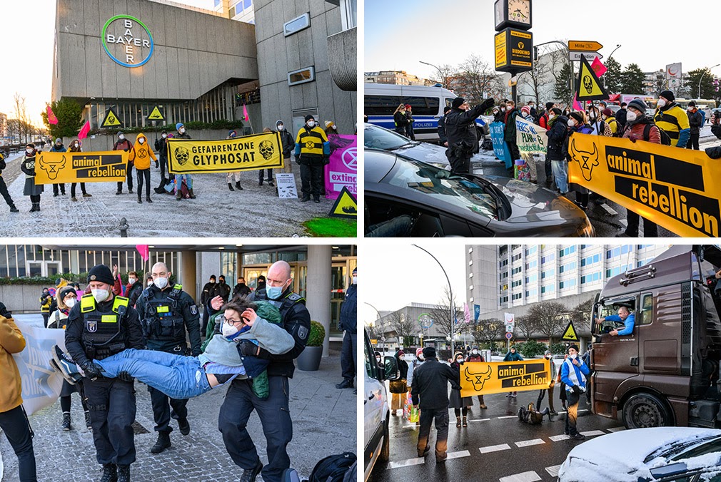 21 JAN | Berlin, Germany XR and Animal Rebellion activists blockade Bayer-Monsanto, which creates ecocidal herbicides like bee-killing glyphosate Photos: Stefan Mueller