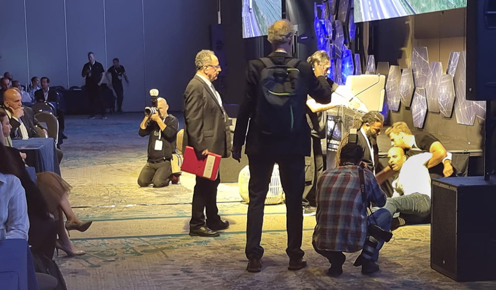 17 MAY | Tel Aviv, Israel: Rebels glued their hands to the podium to disrupt the National Energy Conference of the Israel Energy and Environment Institute. Outside, more rebels threw fake blood over the Hilton Hotel entrance and staged a die-in. Three were arrested.