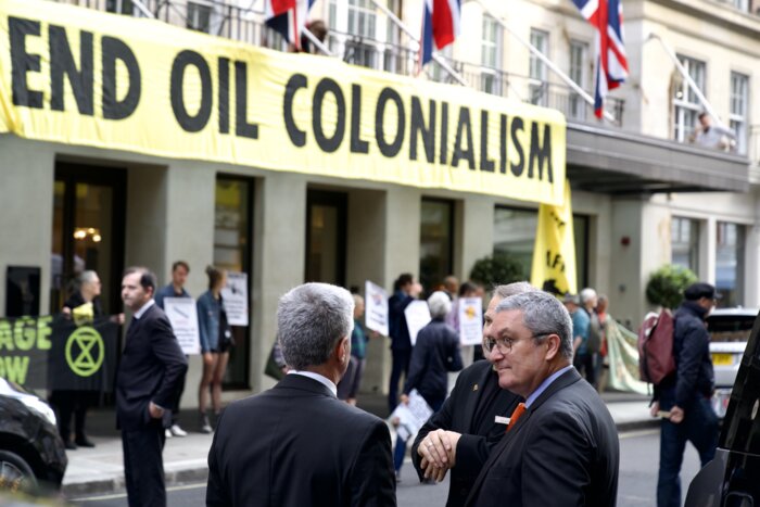 17 MAY London | UK: Rebels joined a coalition of activists to infiltrate and disrupt the Africa Energies Summit, an event for investors and extractors of the continent’s fossil fuels, as well as its politicians. Watch how rebels arrived at the summit here.