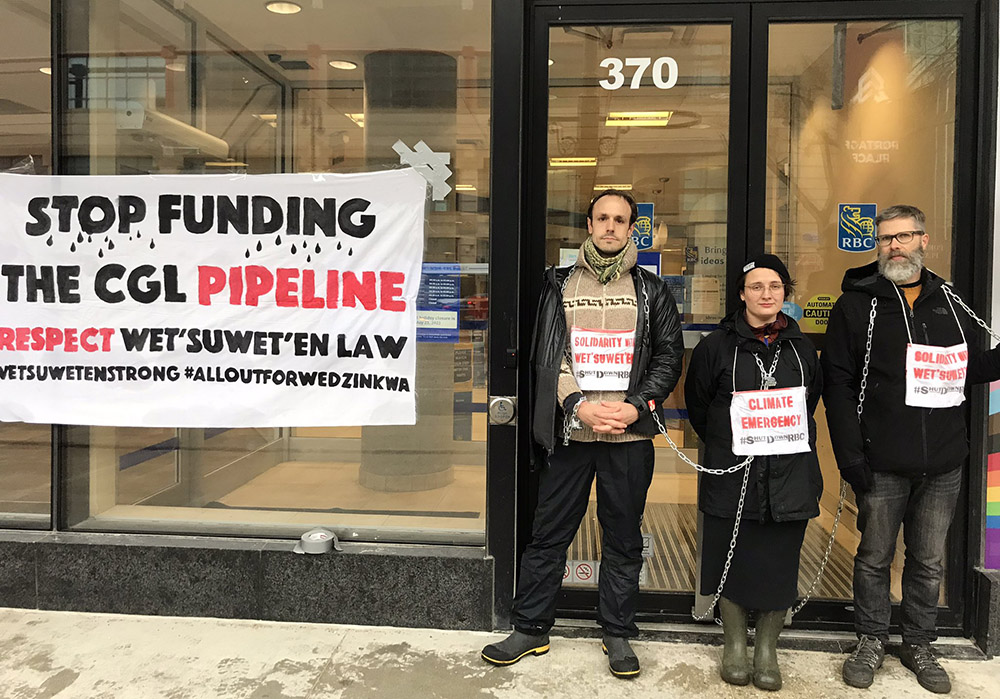18 MAY | Winnipeg, Canada: Activists chained themselves outside the Royal Bank of Canada (RBC) to protest the Coastal GasLink pipeline being built through the indigenous Wet’suwet’en territory in British Columbia. RBC has put $262 billion into fossil fuel projects since 2015, including a $6.8 billion loan for the Coastal GasLink.