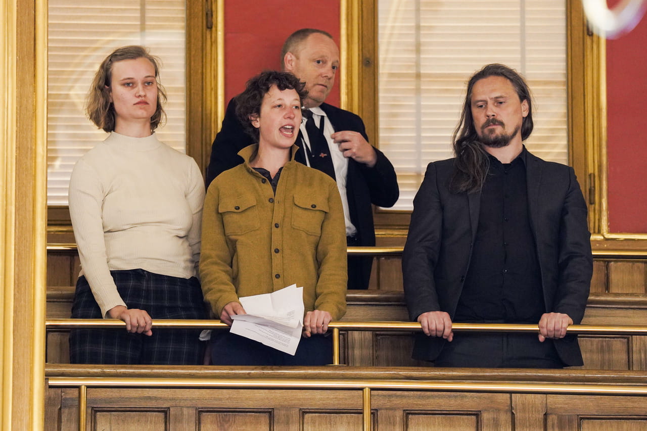 18 MAY | Oslo, Norway: XR Youth Norway organised an infiltration of Parliament. Rebels glued themselves to the gallery and urged the politicians below to use what little time they had left to act on the Climate Emergency. Photo: Heiko Junge/NTB.