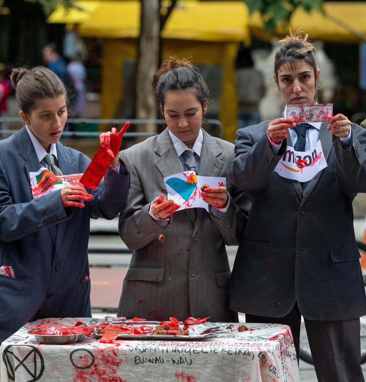 26 JUNE | São Paulo, Brazil Rebels representing three of the most ecocidal corporations in Brazil (all based in the Global North) interact with a table of (vegan) meat, red paint, styrofoam cut outs of Brazil and Africa, and money. A chronicle of Brazil’s environmental issues and murdered activists was written on the tablecloth.
