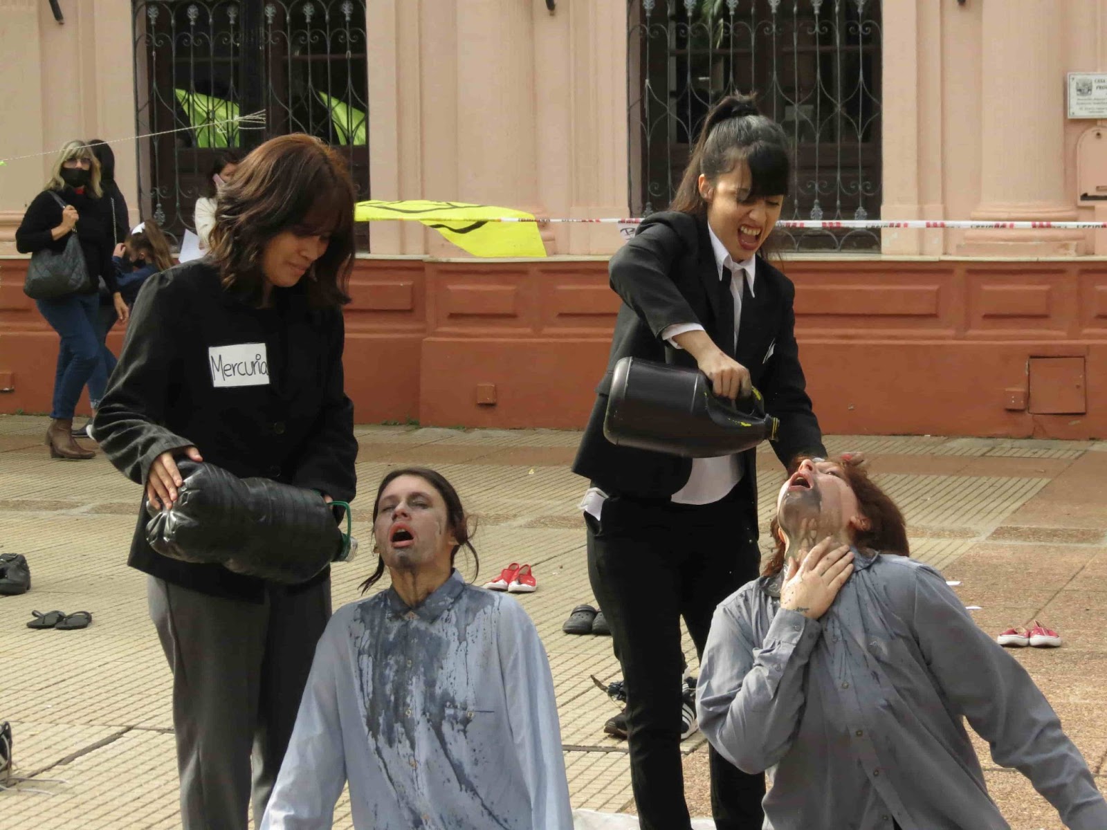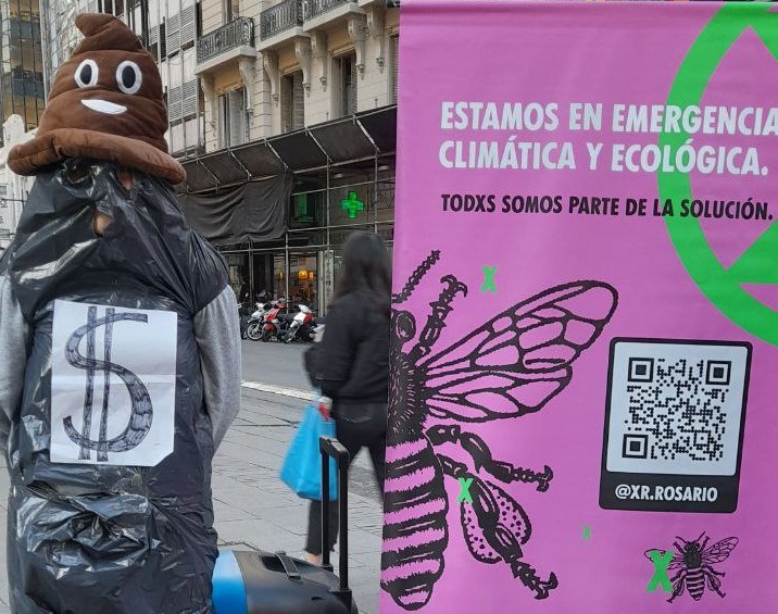 28 JUNE | Rosario, Argentina Rebels with special emoji hats performed an auction of the Paraná river. Rebels representing G7 governments then began bidding. When one of them won, a special piñata of poo exploded. Vast amounts of sewage waste is dumped into the Paraná river each year, and a treatment plant has been promised for twenty years.