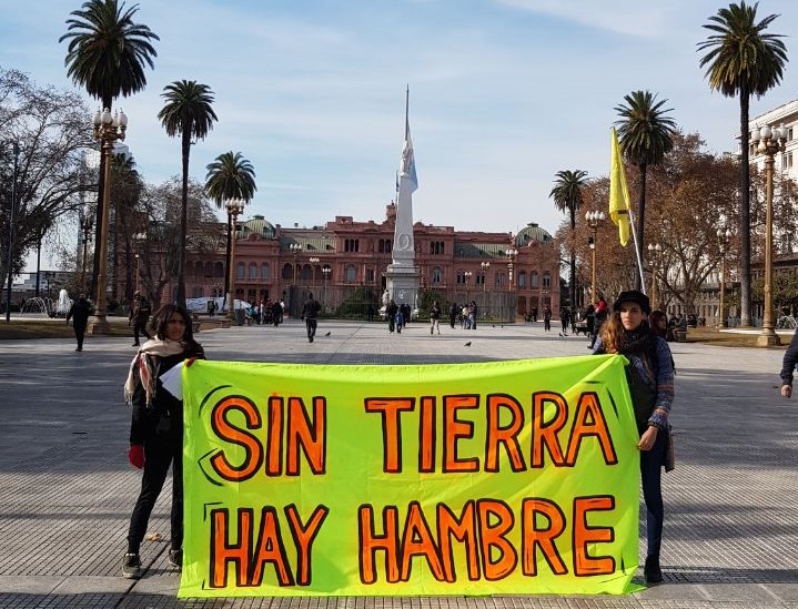 25 JUNE | Buenos Aires, Argentina Rebels hold a banner (Without land there is hunger) that had previously hung from a car circling the city blaring a message: “I buy carbon bonds, I buy governments, I buy soya, I buy justice, Madam, I buy rivers, I buy agrochemicals, I buy media ''. The XR outreach action saw rebels hand out flyers and chat to pedestrians about the extractivism devastating their country.