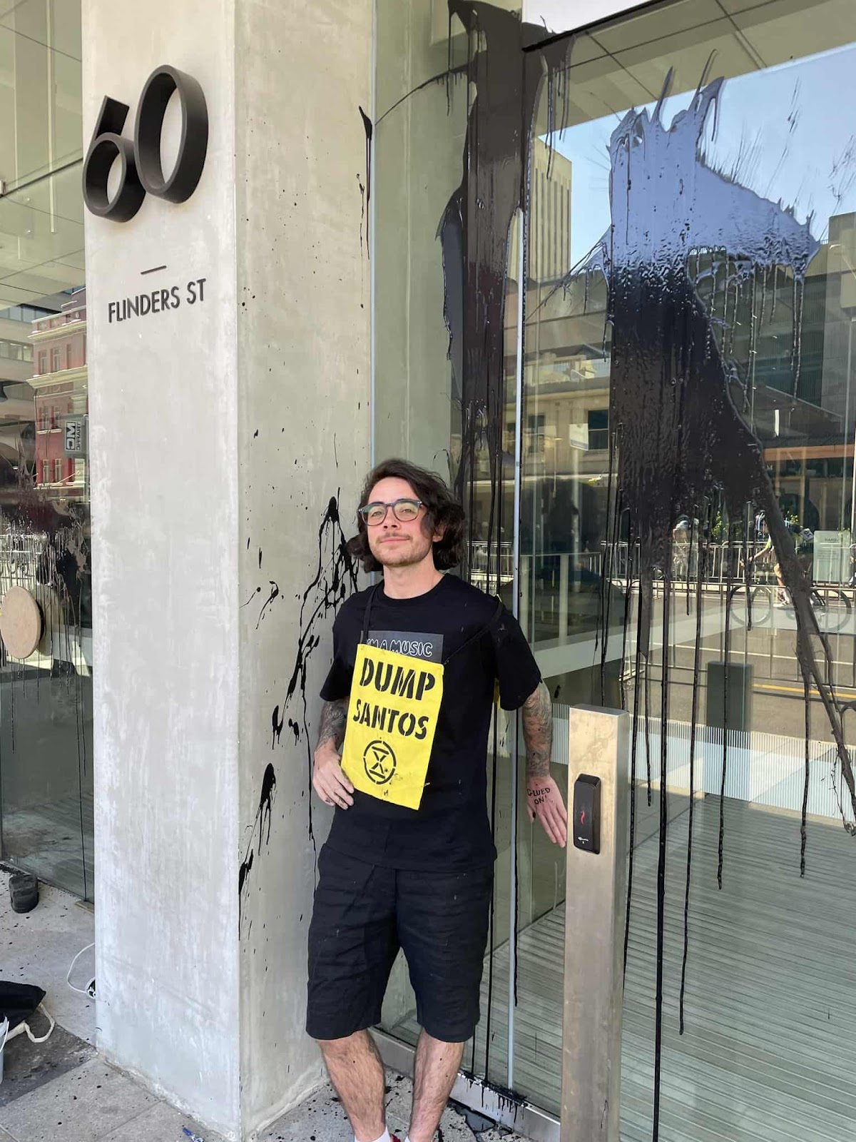 21 JAN | Adelaide, Australia: Rebels chuck paint at and glue themselves to the offices of Santos, the energy giant sponsoring a major cycling race in the city despite poisoning the region with oil spills. It also plans to raze local forests for gas wells.