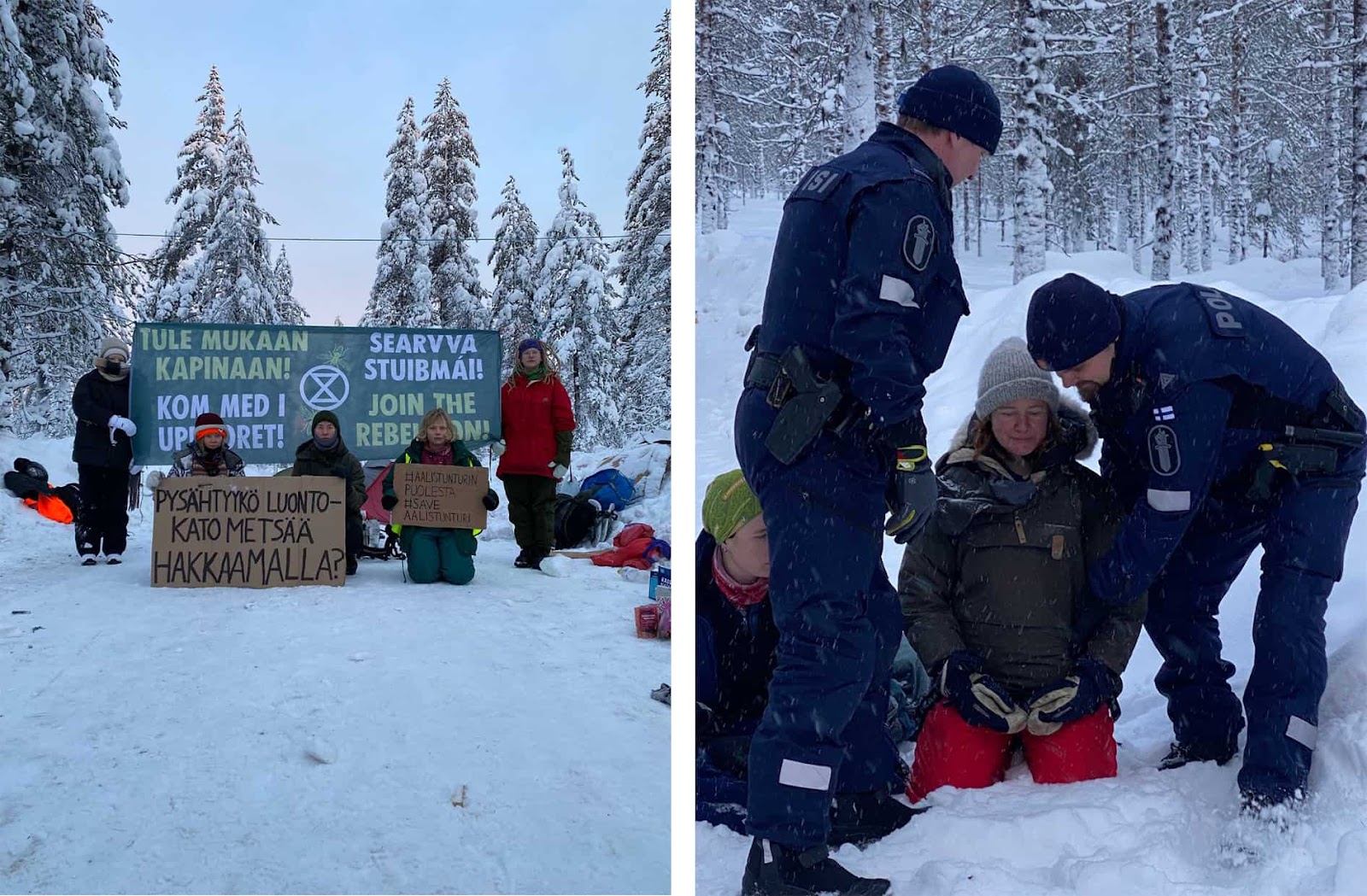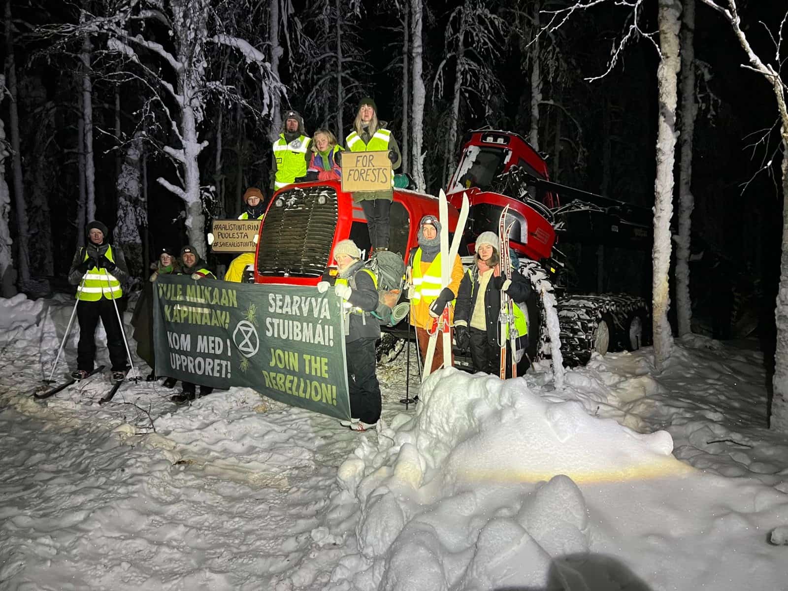 After trekking on skis through the remote wilderness of snow-coated Lapland, four Metsäliike (Forest Movement) activists set up camp among the trees. Eleven more activists from Elokapina (XR Finland), Greenpeace, and other organisations quickly joined them, and as night fell, the group started setting up roadblocks.