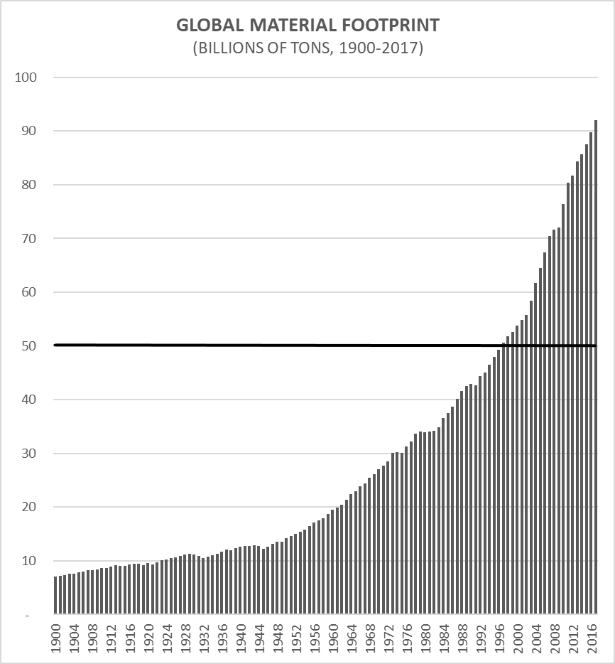 The material consumption of the global economy, all of it extracted from nature. The horizontal line represents the sustainable limit, which we rocketed past in 1999.