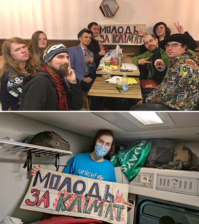 Top: The first meeting of XR Ukraine & FFF Ukraine in November 2021. Bottom: One of the coordinators on a sleeper train, evacuating from Kharkiv to Kyiv in February 2022. “I was fighting against the Climate Crisis. Now I am fleeing a war caused by fossil fuels.”