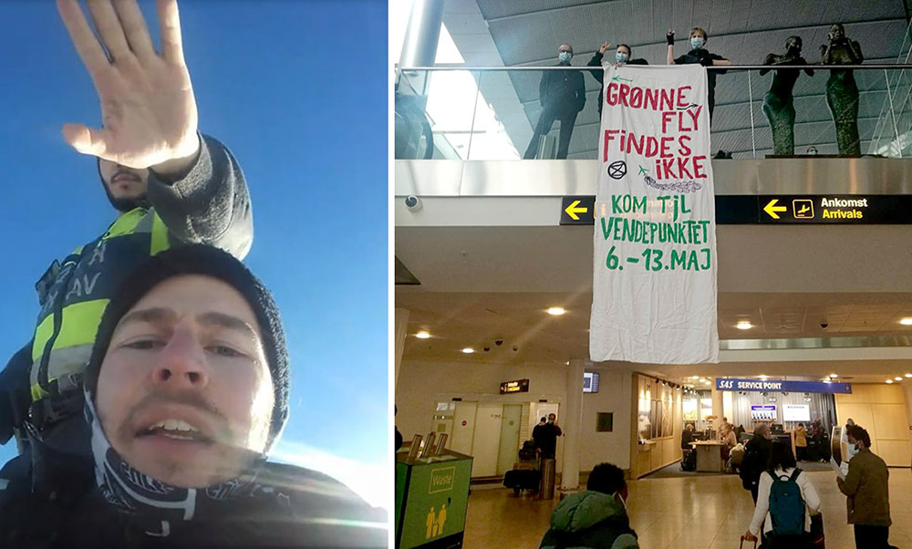 Left: A rebel at Bromma airport in Sweden gets arrested on the runway. Right: Rebels unveil a banner (Green flights do not exist) in Copenhagen’s Kastrup airport.