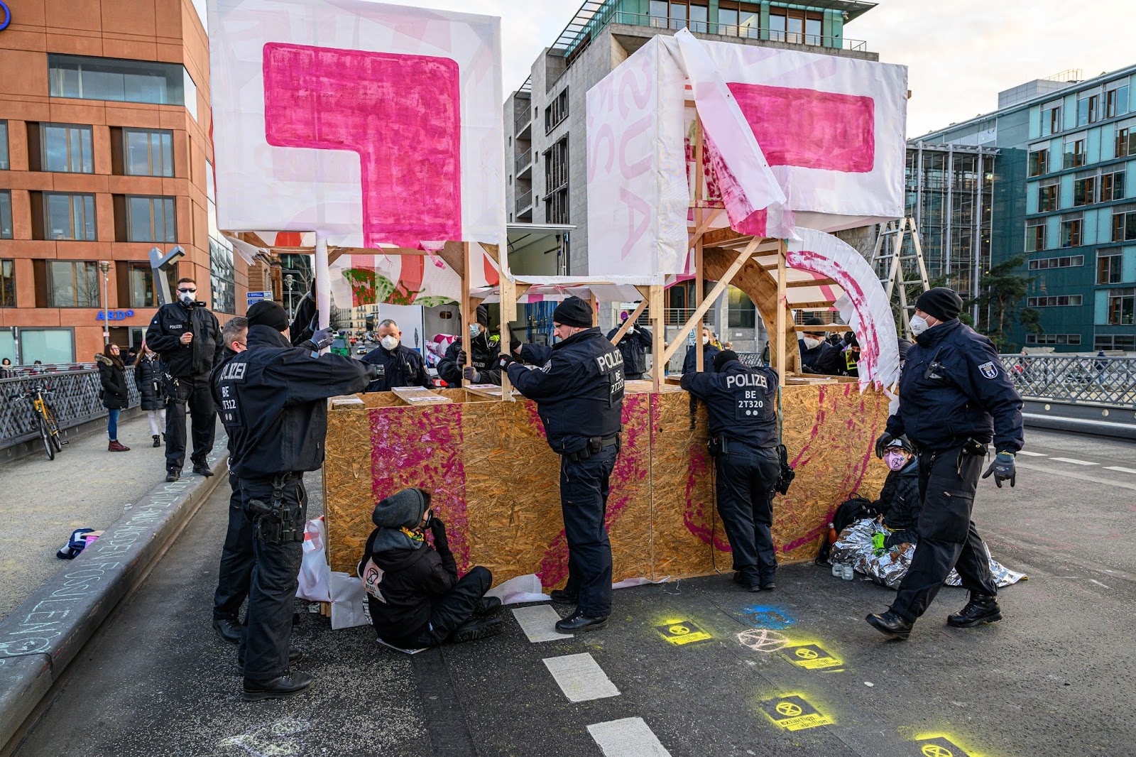 Police dismantle a giant 1.5° symbol during a rebel blockade of a Berlin bridge after the release of the IPCC report.