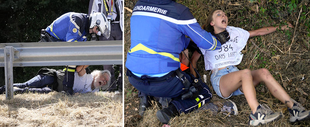 Dernière Rénovation activists are brutally arrested by police after blocking the Tour De France cycling race.