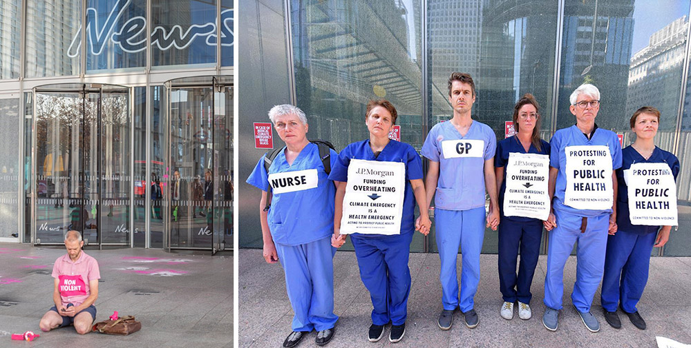 19 JULY | London, UK On the hottest day ever recorded in the UK, two rebels cracked two windows of the News UK building - part of Rupert Murdoch’s media empire which has denied and lied about the climate crisis for decades. Two days earlier, six Doctors for XR were arrested for breaking windows at JP Morgan, the world’s biggest funder of fossil fuels. Photo (right): Denise Laura Baker