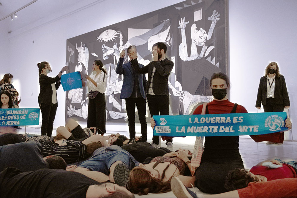 17 JULY | Madrid, Spain XR Madrid and Fridays For Future stage a die-in in front of Guernica by Pablo Picasso to denounce the NATO summit hosted in the city and to push for peace. Signs: War is the death of people. War is the death of art.