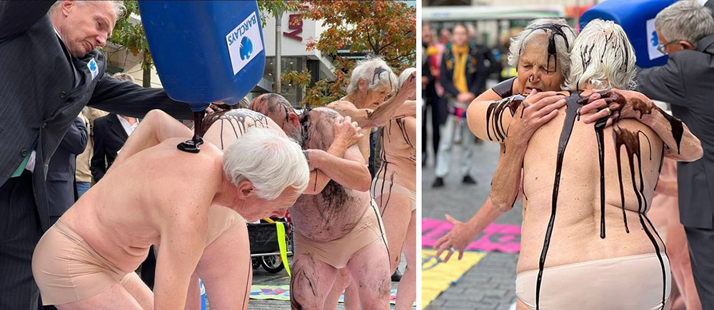 29 OCTOBER | Exeter, UK: Five elderly rebels get doused in fake oil outside a branch of Barclays Bank. One said: "I’m 70. I don’t want to have to take my clothes off in the High Street in order to draw attention to the fact that Barclays Bank continues to invest in fossil fuels, but I have a 4-year-old granddaughter and I will do everything I can to protect the world and her future.” Photos: Shirley Bebbington