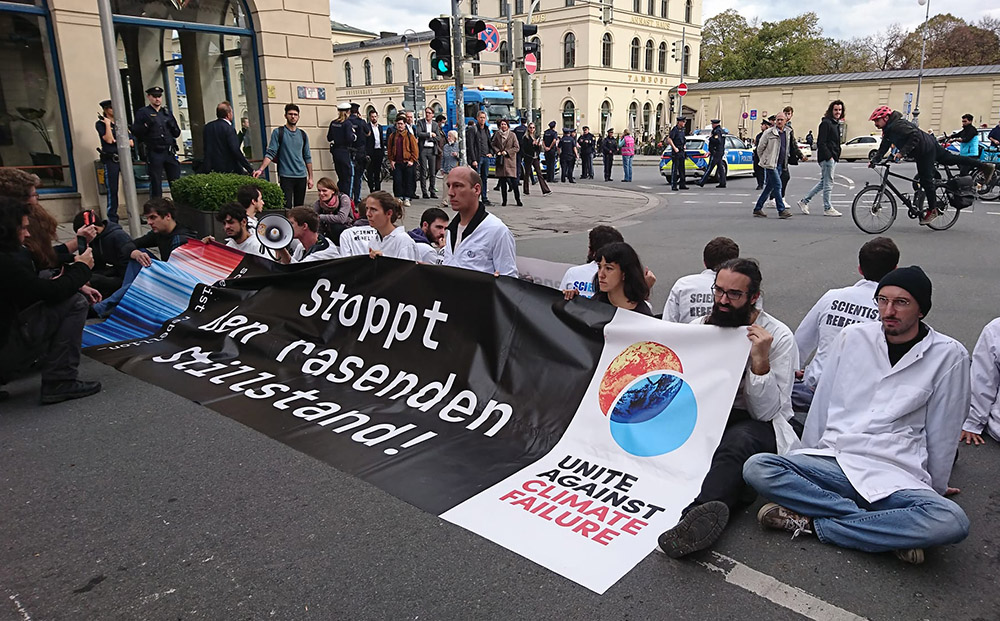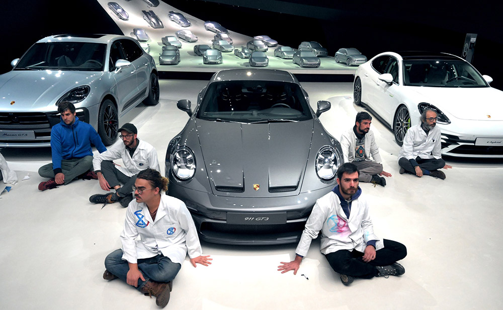 20/29 OCT | Wolfsburg/Munich: Nine Scientist Rebellion activists glue themselves to the Porsche pavilion of the Volkswagen car museum, calling for a 100 km/h speed limit and other measures to drastically reduce German transport emissions. The action became a two-day occupation. A week later, 16 scientists were arrested for glueing themselves to a BMW dealership and blocking an intersection in Munich. All 16 were imprisoned, some for up to 7 days, while awaiting trial.