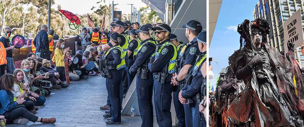 Police block access to the Asia Pacific Oil & Gas conference. Right: The magnificent ‘Oilies’ join the Adelaide protest. Photos: Peter Barnes & Ella Ma.