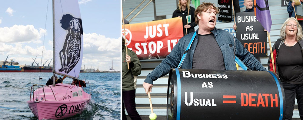 The pink boat returns (hooray!) for the Corio Bay action. Right: a rally in central Melbourne against the financiers of the climate crisis. Photo: Danielle Judd.