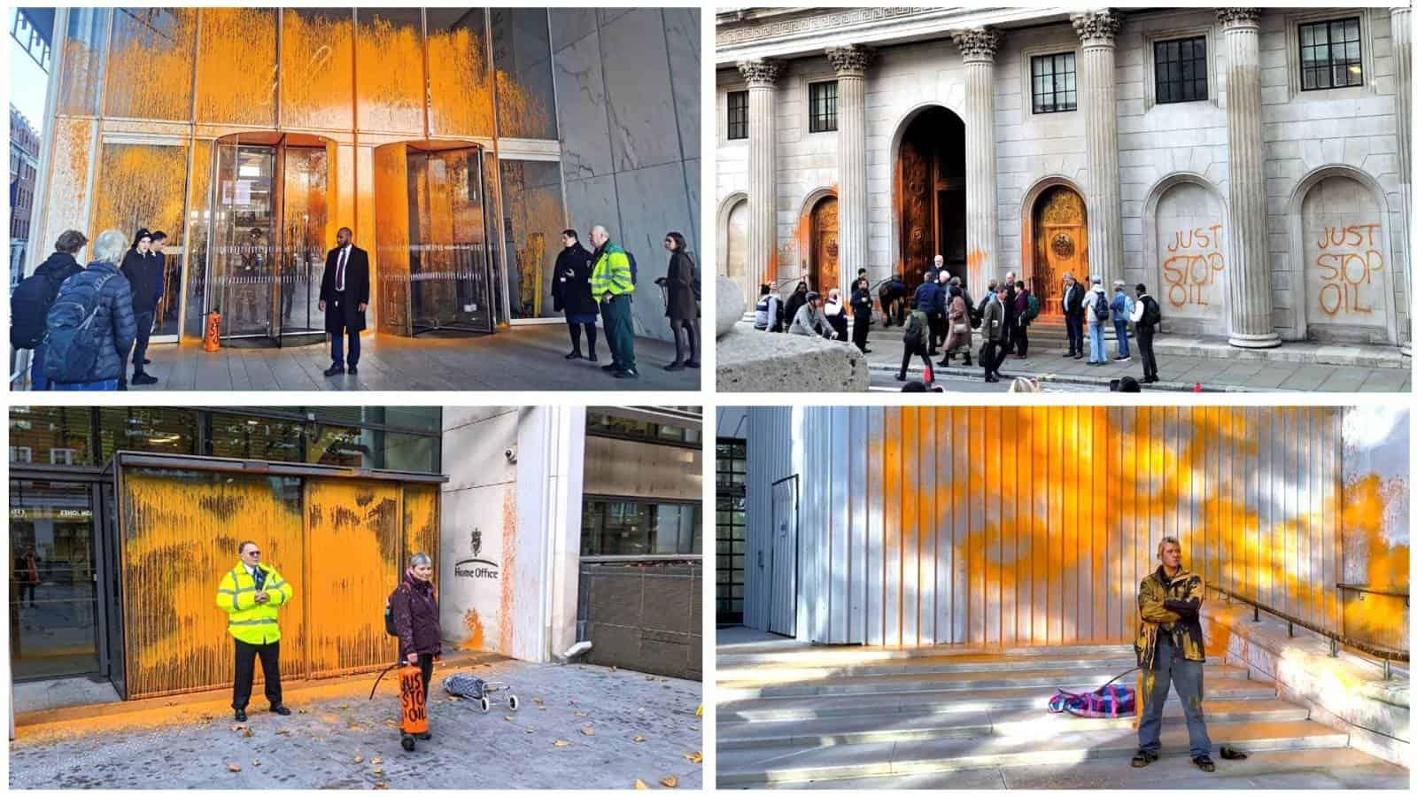 Various institutions culpable for the climate crisis were sprayed with orange paint, inc. media giant News Corp, the Bank of England, the Home Office & MI5.