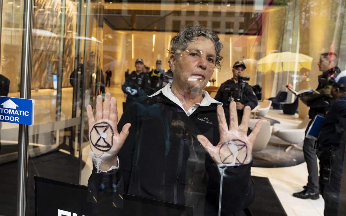 Rebels glue themselves to Australia’s sovereign wealth fund in Melbourne for investing in ecocide. Photo: Matt Hrkac
