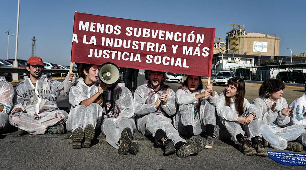 17 OCT | Huelva, Spain: 100 activists from the Rebellion for Climate coalition blockaded the headquarters of Enegás, the main operator of Spain’s gas network. Photo: Rafa del Barrio