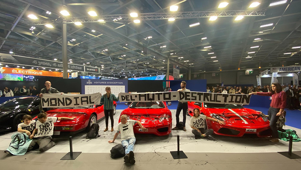 21 OCT | Paris, France: A dozen rebels glue themselves to high-performance cars at the Paris Motor Show. They denounced a polluting industry which greenwashes itself with electric vehicles while continuing to promote the individual car as the transport of the future.
