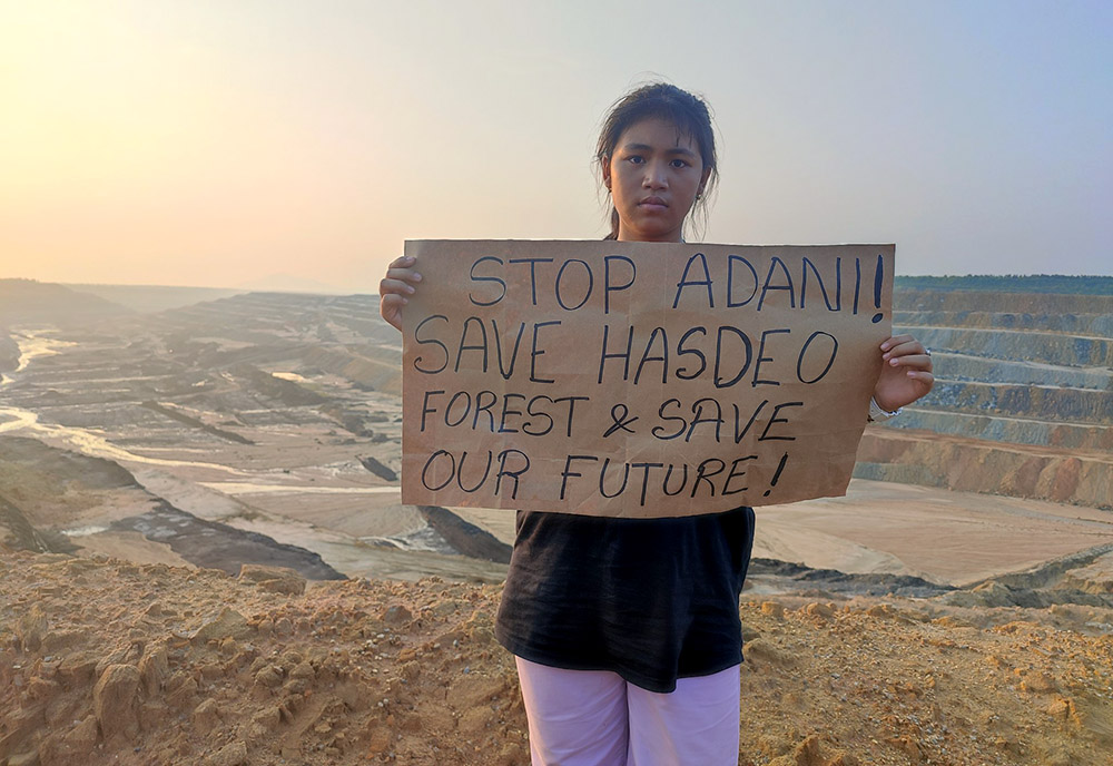 14 OCT | Hasdeo Forest, India: A young environmental activist protests at the Adani Coal Mining site at Hasdeo Forest, Chhattisgarh. The region is a rich biodiversity hotspot covering 170,000 hectares of forest land with over 450 species of plants and animals. More than 20,000 indigenous Adivasi people also live there.