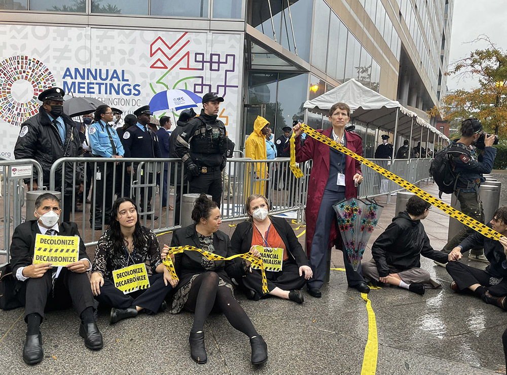 13 OCT | Washington DC, USA: Rebels disrupt the annual meeting of the IMF and World Bank as part of a new wave of Debt For Climate (D4C) actions in the run-up to COP27. Activists blocked the entrance to the summit and chanted “Cancel the debt!” as police dragged them away. The World Bank has invested billions into fossil fuels since the Paris Agreement, and the IMF has forced Global South nations into a debt trap that has hamstrung their efforts to decarbonise.