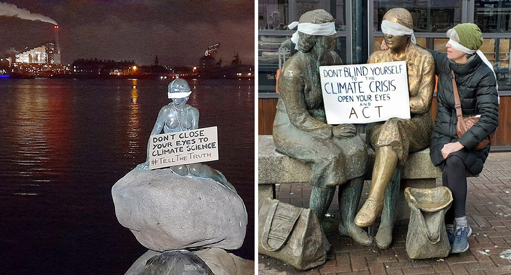 After the report’s release, rebel scientists blindfolded iconic statues around the world, including in Copenhagen (left) and Dublin, to demand that world leaders face the facts!
