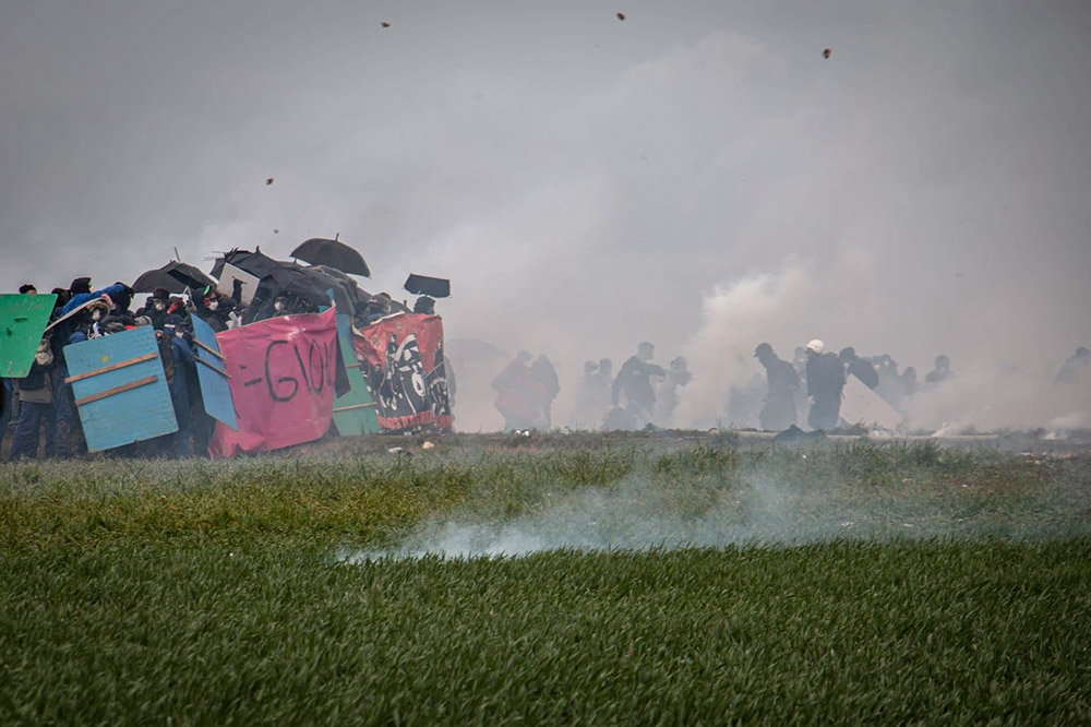 The first wave of protesters aimed to build a peaceful human chain around the mega-basin, but the police response was immediate and extremely violent. The French countryside became a war zone, the air filled with rubber bullets, tear-gas, and the noise of over 5000 explosive stun grenades. 200 activists were wounded, 40 severely, with injuries including grenade shards embedded in their flesh (warning: gruesome imagery). Two remain in a coma.