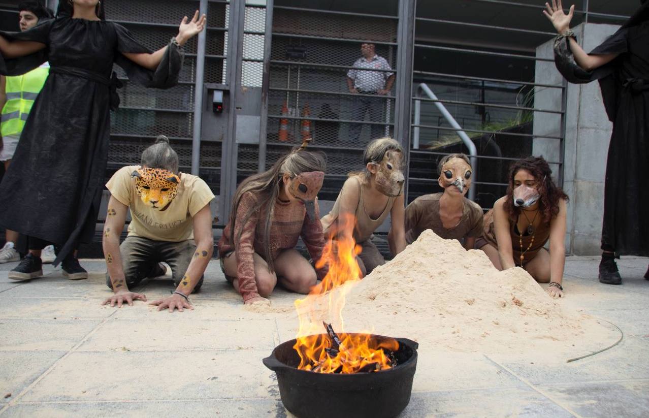 Rebels perform outside Arauco’s Buenos Aires HQ. Photo: Julieta Gimenez