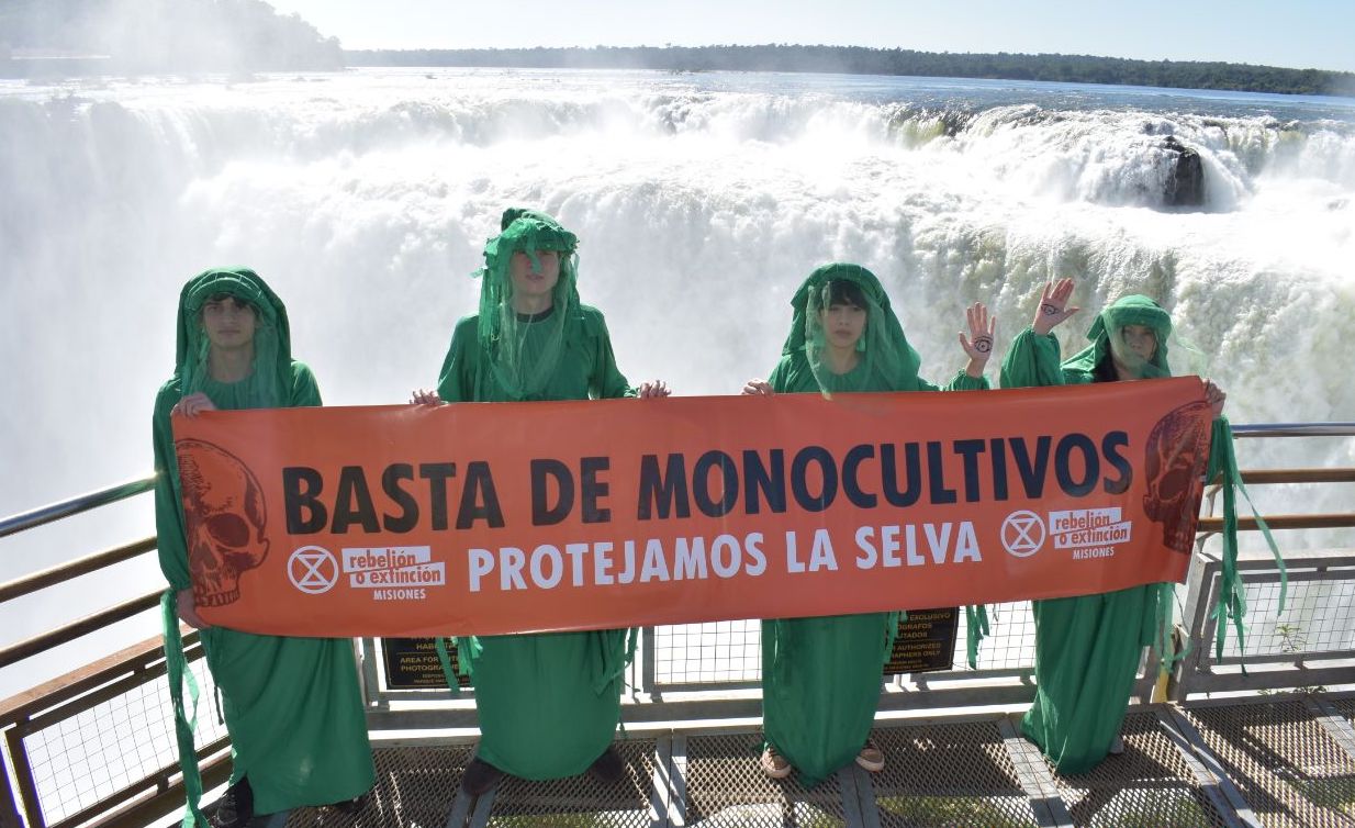 A week after the protest-performance, ten rebels travelled to Iguazú Falls in Misiones, one of the most richly biodiverse national parks in the world. En route, the rebels defaced Arauco billboards along the highway, calling out their years of ecocide. On arrival, they donned animal masks and Green Brigade costumes, winning the attention and enthusiastic support of passing visitors.