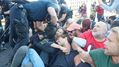 Police set up a perimeter and arrested rebels in waves. Despite the high arrest count, the sunkissed rebellion base in nearby Washington Square park was buzzing. Actions will be continuing here over the coming days, and are expected to spread to Chicago and Washington DC later in the week.