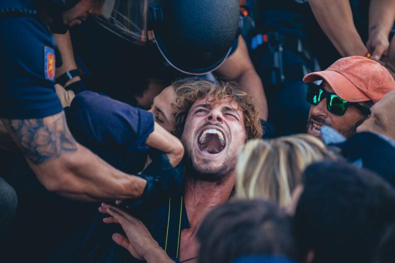 Madrid rebels had a dramatic first day of Rebellion! 300 rebels surrounded a pink boat to block a bridge and were greeted by an alarming police response that included twisting arms, pressing thumbs into rebels' eyes and putting pressure under their jaws. 10 rebels were hospitalised and many others suffered minor injuries. There were 43 arrests that day in Madrid.