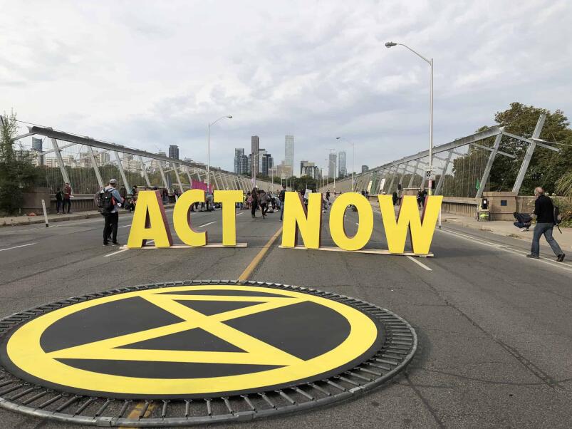 XR Toronto gathered at Playter Gardens in the city's east end for a day of October Rebellion. After an early morning debriefing, protesters took to the Bloor Viaduct with banners, signs, and megaphones, numbers bolstered by other groups and allies.