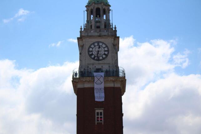 Looming over the action were Extinction Rebellion banners and messages, draped across the Viaduct walls, and the organization's iconic hourglass logo set at an impressive height.