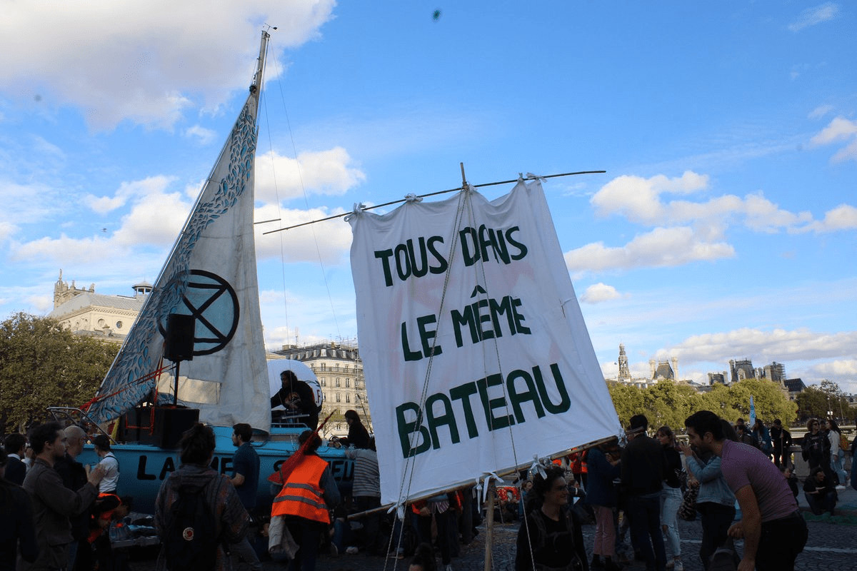 Rebels reminiscent of the now symbolic pink boat Berta Cáceres that reigned over London's Oxford Circus during the last international rebellion can be reassured -- its blue brother has crossed the channel for this October and cast its anchor in Parisian waters.