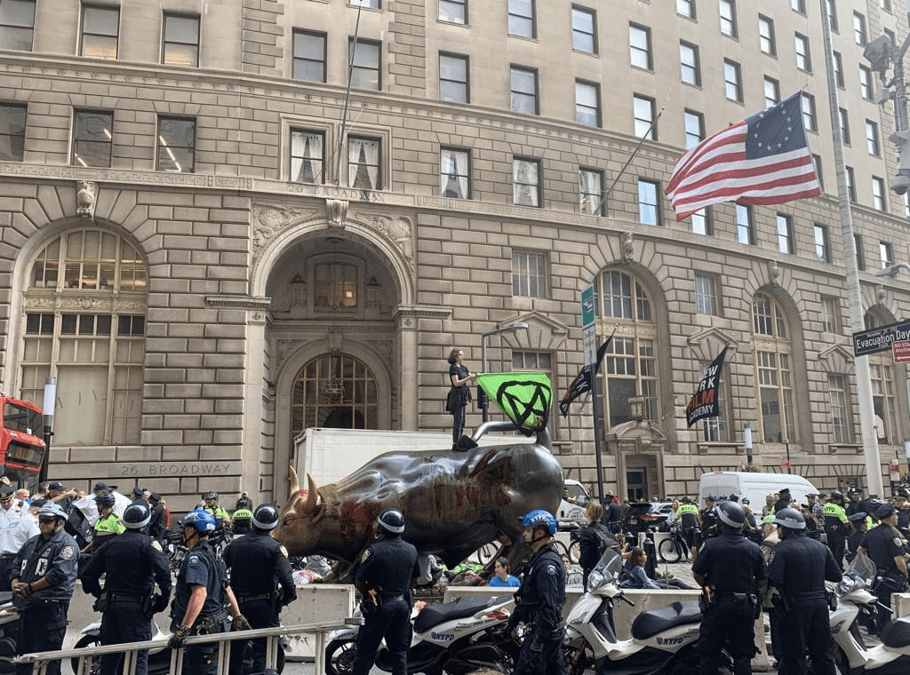 Around 90 New Yorker rebels were arrested yesterday after they launched a wave of actions in the city's famous financial district. Protesters poured fake blood over Wall Street's iconic Bull statue, held a very bloody die-in outside the New York stock exchange, and then blocked a nearby road.