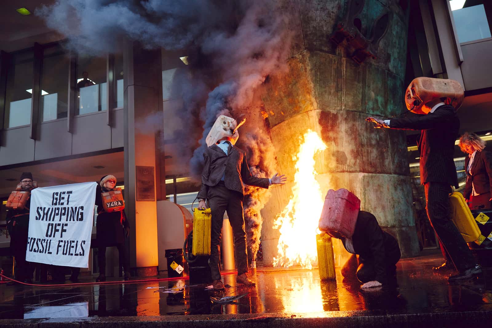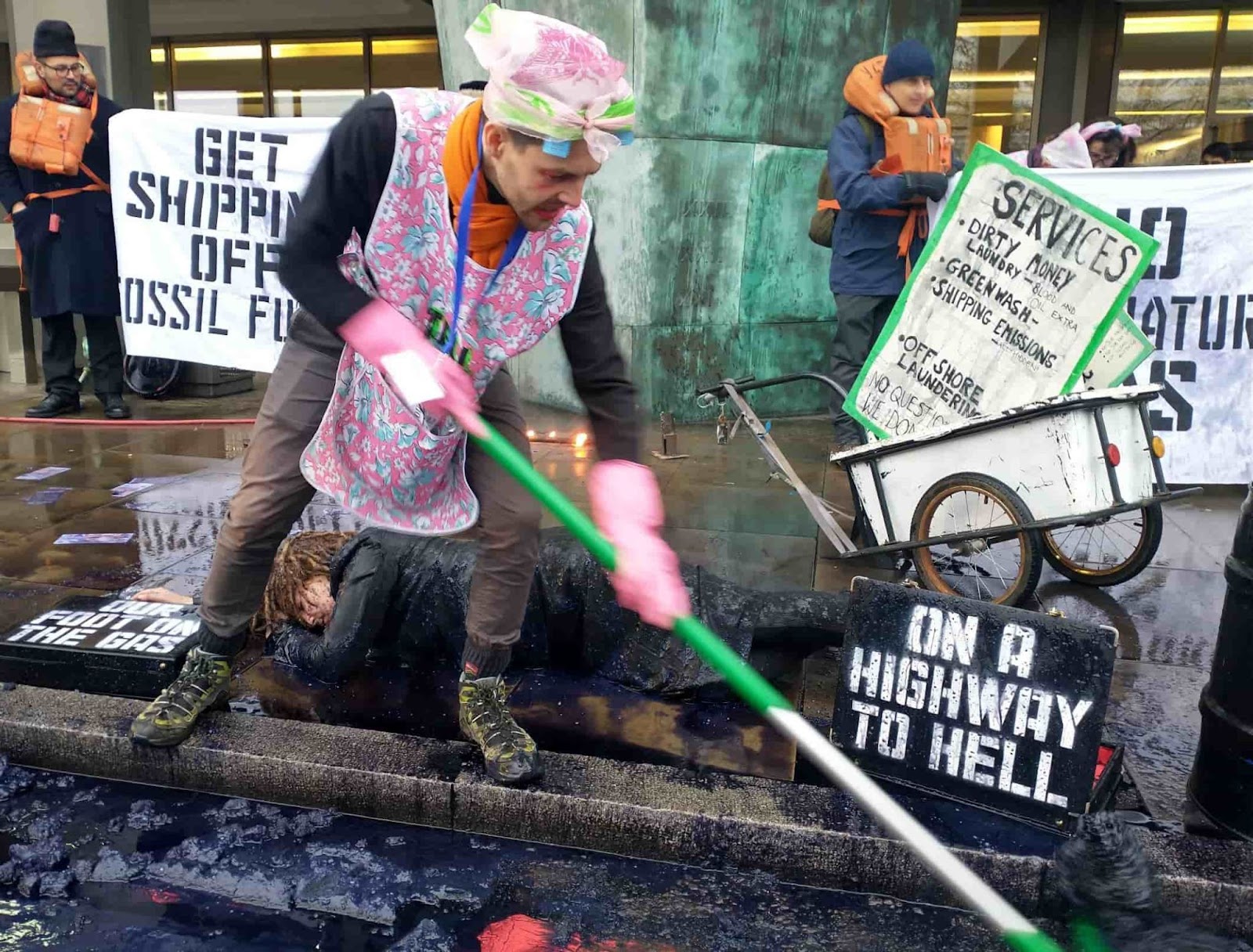 12 DEC | London, UK: Ocean Rebellion rebels welcome delegates of the Marine Environment Protection Committee, which was meeting at the UN International Maritime Organisation (IMO). The IMO continues to allow cargo ships and oil tankers to burn Heavy Fuel Oil at sea, which is extremely toxic. Photo: João Daniel Pereira
