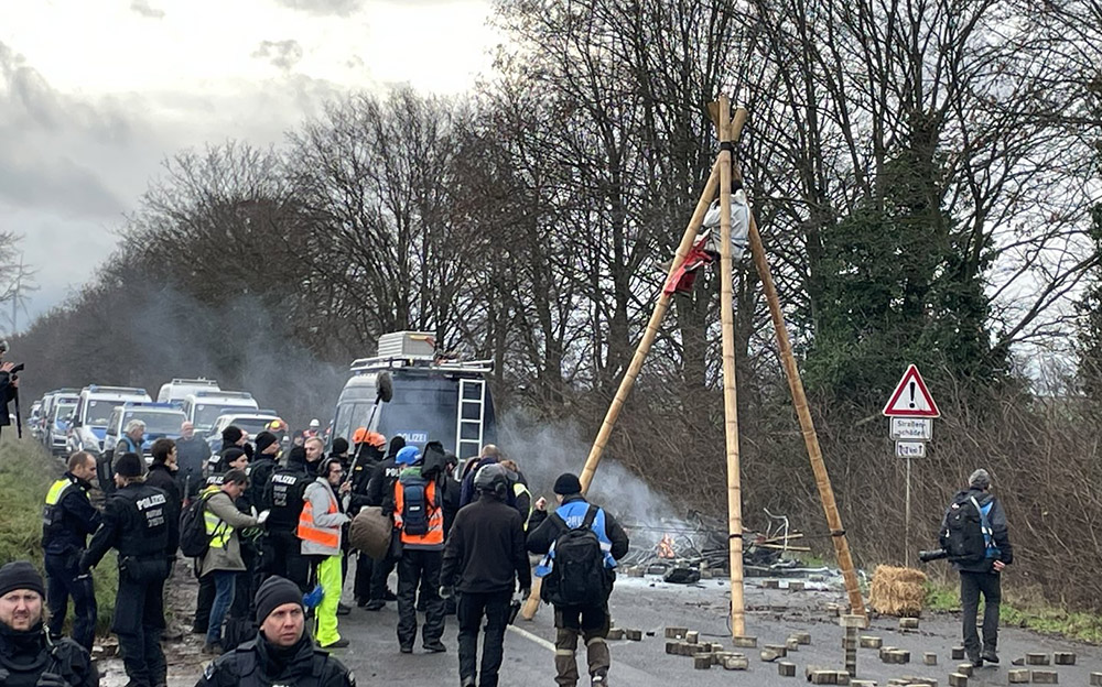 Police prepare to dismantle a tripod blocking an approach road to Lützerath.