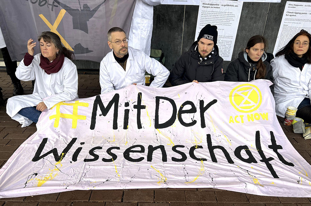 21 DEC | Düsseldorf, Germany: 14 scientists and students block the entrance to a regional Ministry of Economic Affairs in Düsseldorf in solidarity with Lützerath. They spread charcoal across its entrance and pasted scientific studies of the climate crisis on its walls. “If Lützerath falls, Germany will break its climate targets and continue on the highway to climate hell. If Lützerath stays, it could be the beginning of the end of the destructive fossil fuel combustion system.”